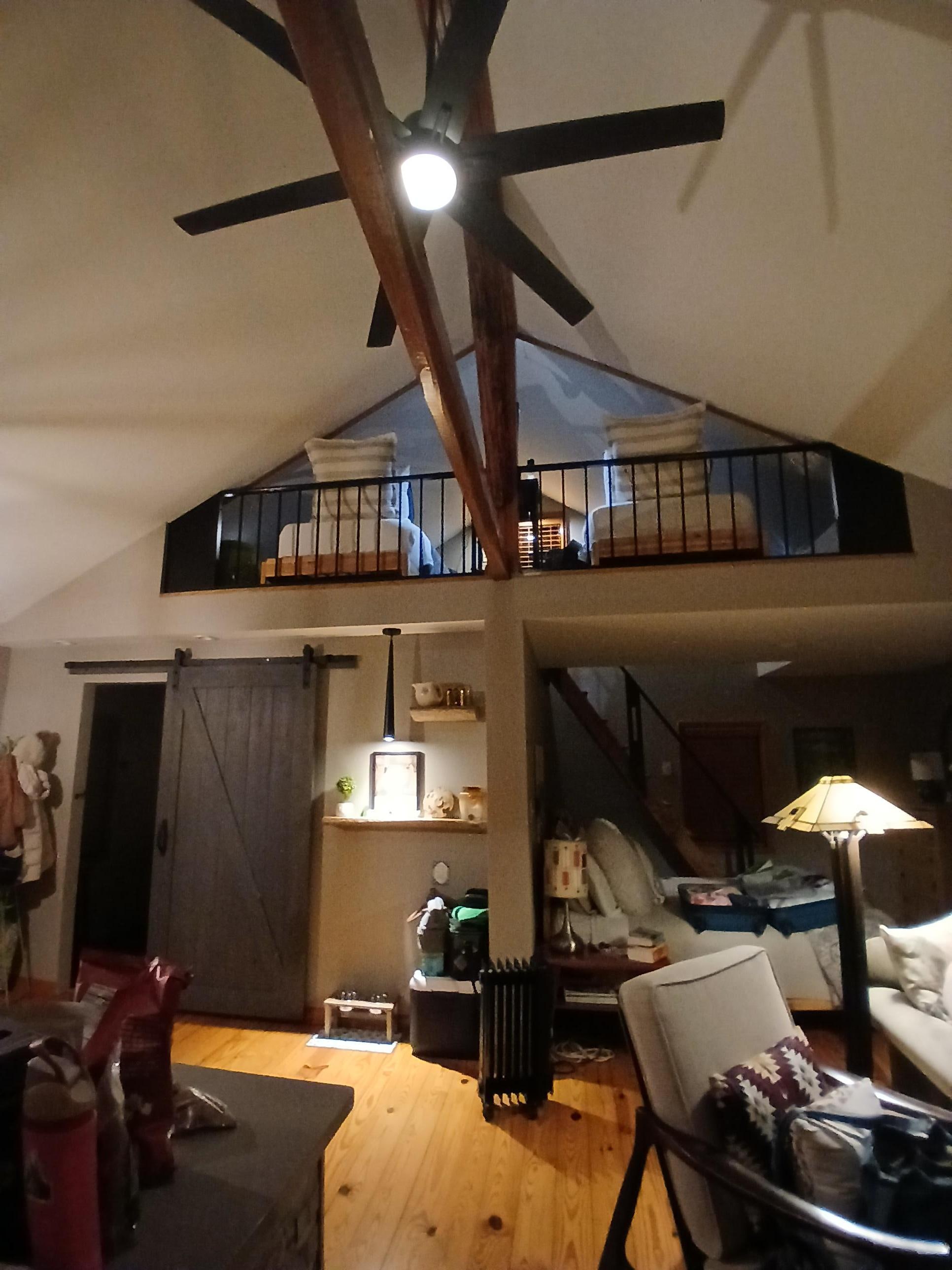 The open-concept main level includes a large, well-equipped kitchen with dining area, spacious living room, and bedroom with a queen bed. The cozy loft features two twin beds.