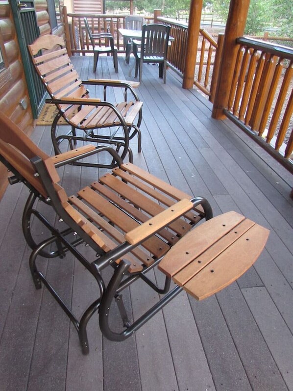 Hytta har et fint dekk i fronten med avslappende tre-vippegli for å nyte naturen. På baksiden har den et større dekk med et piknikbord og stoler rundt seg i tilfelle du vil spise ute. På bakdekket har vi også 2 glider-rockere å glede oss over. I hagen sitter en 4-manns badestamp å slappe av i. Vi har lagt til en branngrop i bakgården som du kan bruke hvis brannbegrensningene tillater det. Kontroller det før du bruker det. Merk: grillgrillen er flyttet inn i hagen nær dekket. Bakgården er inngjerdet for å hjelpe til med å se på barna og hundene dine mens du slapper av. Merk: Hvis et kjæledyr blir brakt til hytta, må du også ta med et kjæledyrskasse. Dette må brukes hvis du forlater hytta.