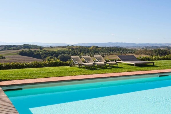 The Villa belongs to Tenuta Larnianone, a family run wine estate of 340 acres, that counts 8 different Villas and Apartments surrounded by vineyards and olive groves, at 5km from Siena. The Estate is completely immersed in the countryside (you need a car to get to the grocery!) but is only 13 minutes to the closest supermarket and about 20 to Siena's city center. What to expect: Villa Santa Virginia it's a 480 sqm Villa, with 6 bedrooms with A/C and ensuite bathrooms, all at the first floor; it can accomodate 12 adults and 2 kids under 12. At the ground floor there is the living room, a small bathroom and the kitchen with dining room. Outside, just a few meters from the Villa there is a swimming pool with a spectacular view on the Val D'Orcia. The villa has also one annex that is available for rental only for the guests of the main Villa, at an additional price. It's called Pollaio Suite and it has got a double room, a bathroom with shower and A/C.Villa Santa Virginia is a typical Tuscan farmhouse restored respecting the original structure but equipped with all modern comforts. FAQ: There is air conditioning in the bedrooms and fans in all the other rooms. Heating cost is included. Renting a car is highly recommended (you can't go shopping on foot from the estate!) In Siena there is no Uber service and taxis are not always available. The swimming pool is guaranteed from 1st of May to 30th September; it's open from 8AM to 8PM Only the guests of the Estate are allowed to enjoy the shared swimming pool spaces. The pool IS NOT HEATED. The organization of any event involves extra costs to be defined when booking with the property. The kitchen is equipped with stove, oven, dishwasher, coffee machine (NESPRESSO), pots, salt / pepper and our extra virgin olive oil. We provide plastic bags, dishwasher tablets, laundry soaps and fabric softener to our guests, as well as some courtesy coffee pods. The bathrooms have hairdryers and at the entrance we provide a small welcome kit with shower shampoo in paper sachets. It is possible to request a basic shopping to be found on the arrival, at an extra cost of 50 euros. GROUND FLOOR Entrance Dining room with traditional fireplace Living room with tuscany traditional fireplace Kitchen Toilette FIRST FLOOR Double bedroom with king size bed, ensuite bathroom (bath tub and shower) and big private terrace. Double bedroom with 2 single beds and ensuite bathroom (bath tub and shower) Triple bedroom with double bed, single bed and ensuite bathroom with shower. Double bedroom and ensuite bathroom (shower) Double bedroom with 2 single beds and ensuite bathroom (shower) Bedroom with single bed and ensuite bathroom (shower) Who will you meet and what do to: The owners are at your disposal for any information, especially regarding restaurants and activities, or to solve any problems efficiently if needed. During your stay it is possible to organize Palio experiences (2nd of July and 16th of August), dinners in Villa, bike tours, city and surrounding tours, horse riding through the Estate, truffle hunting and of course the visit to the cellar where Lorenzo, will organize the wine an olive oil tasting. All the information to book these activities (and more!) are provided in the Guestbook, once made the reservation. The Estate is located in a strategic position: - 20 minutes far from Siena's city center, a go-kart circuit, the thermal baths at Rapolano Terme, an alpaca farm, an adventure park for kids, and the artistic site Parco Sculture del Chianti; - about one hour away from San Gimignano (where to taste the best ice cream of the world at Dondoli's), Florence, Montepulciano, Montalcino, Pienza (the famous cheese city of Tuscany), Volterra and Panzano in Chianti (where is located the most famous butcher of the Chianti, Dario Cecchini) - about two hours far from Assisi, Rome, Pisa, Lucca and seaside famous places like Forte de' Marmi and Argentario's peninsula. The best location to enjoy a true tuscan experience!