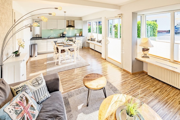Vi inviterer deg til å føle deg hjemme på ca 70m ², slappe av fra hverdagen og slappe av. I tillegg til det romslige inngangspartiet finner du to soverom, to fullt utstyrte bad (inkludert et bad med vaskemaskin) og en koselig stue-spisestue. For din avslappende søvn, venter våre høye kvalitet kassefjærsenger for deg i begge soverom. To bad, både med dusj og toalett, vil spare deg om morgen ventetiden for et gratis bad. Bruk vårt moderne og samtidig koselig innredet stue / spisestue for underholdende spillkvelder i en omgjengelig runde eller opplevelse foran en av våre nye flatskjerm-TV (104cm diagonal) spennende filmkvelder. Vårt åpne kjøkken vil gi deg alt du trenger for en fin frokost eller middag. (Ovn, fire keramiske kokeplater, kjøleskap med fryser, oppvaskmaskin, kaffemaskin, brødrister, vannkoker og selvfølgelig er det nok bestikk og servise tilgjengelig) Sist men ikke minst, Appartement & # 132; LUV & # 147; en annen nydelig terrasse med en høykvalitets hage strandstol og 2 andre sittegrupper, hvor du kan avslutte ferien avslappet.
