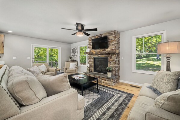 * Living Room: Smart TV, cozy stone fireplace