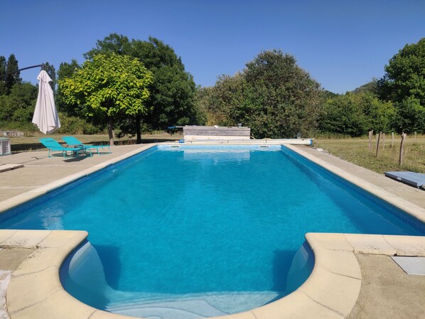 Une piscine privée plein sud non chauffée (10mX5m profondeur uniforme de 1.5m) avec un espace barbecue.