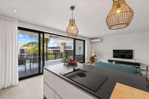 Step out onto the terrace and enjoy the tranquil ambiance of the surrounding tropical gardens from an elevated vantage point, but you’ll find the real charm lies in the seamless connection between the comfortable interiors and the lush outdoors. The terrace doubles as an extension of the living space, ideal for morning coffee or evening relaxation.