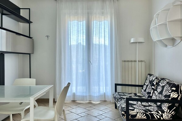 Description: First floor of a four-family house. New living room with dining table and double sofa bed - separate kitchen with dishwasher - master bedroom with double bed - second bedroom with two single beds (one of which is a pull-out bed) - bathroom with shower - terrace equipped with table and chairs.