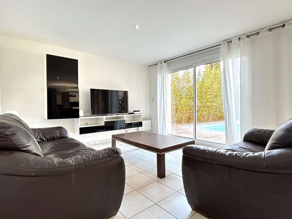 You have a large furnished terrace (barbecue), a garden and a beautiful swimming pool with sea view.
