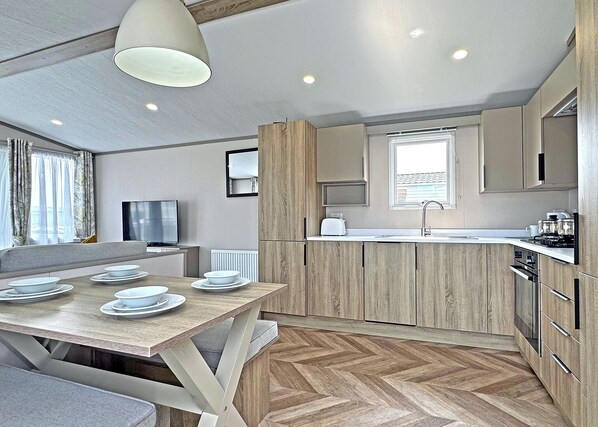 Flatscreen TV, shower, additional sleeping for two in the lounge area, kitchen including gas cooker, microwave and domestic fridge/freezer, and gas and electricity included. Bed linen included. Heating: Electric fire to the lounge, domestic central heating and double glazing. Access: 3 steps with handrail leading onto wrap-around decking.