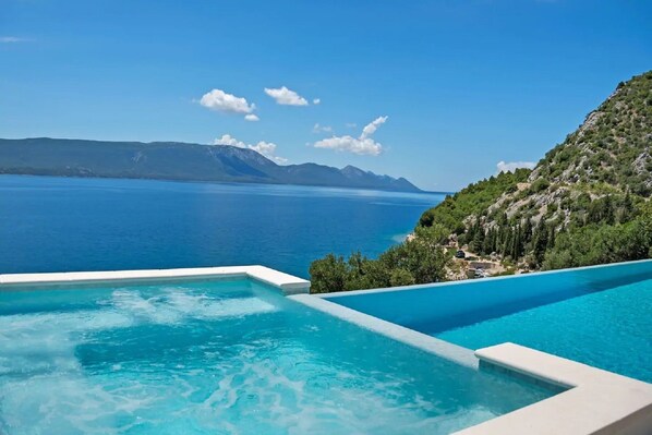 12 guests can enjoy a private pool, jacuzzi, grill, and terrace. The interior is fully equipped and it consists out of 6 bedrooms, 4 bathrooms (2 of them en-suite), 2 living areas, and 2 kitchens. Outside guests can use sun loungers around heated infinity swimming pool, nearby there is dining area with outdoor fireplace and futsal pitch on lower level of the property. Bicycles (6 of them) are available for guests to explore local area ideal for cycling and having fun during your stay.Throughout whole property guests can enjoy in spectacular view on local bay and nearby beaches.