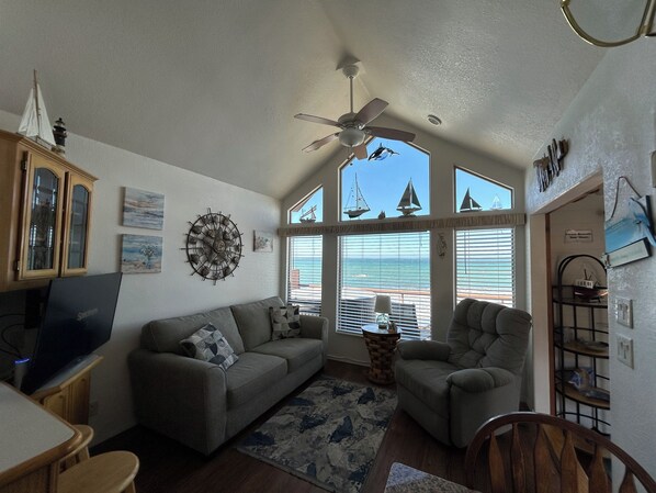 Our cabin is fully equipped with everything you need to feel right at home. A spacious and comfy living room and dining area overlooking the ocean, a fully equipped kitchen, a downstairs master bedroom with a queen bed, bathroom with shower and bathtub and upstairs NON-STANDING loft with two twin beds . Please note the stairs are a bit steep.