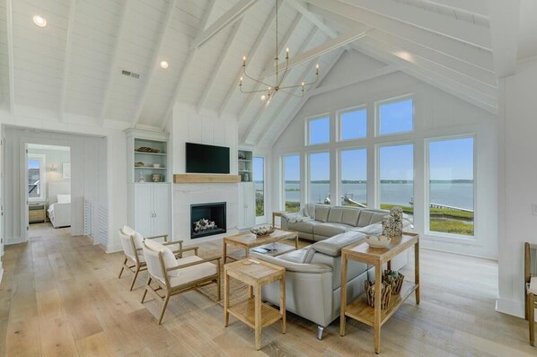 The outside activities are endless. Enjoy a splash in the private pool. There is plenty of seating for everyone while you grill out and enjoy some conversation under the umbrellas. Practice your putting skills for a day on the golf course on your personal putting green or take your best shot at a game of ping pong. Perhaps you have a corn hole tournament on your own covered deck. Take a stroll down the dock and do some fishing or take an unforgettable sunset. Finish the day sitting around the fire-pit catching up and reliving the days’ memories.
