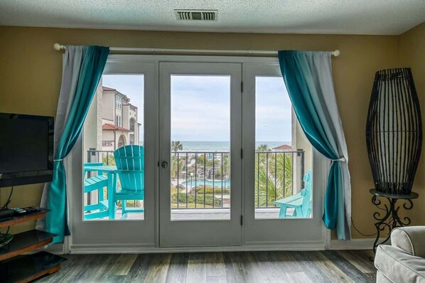 Living Room: queen sofa sleeper, side chair, TV, ceiling fan, tray tables, Door to oceanfront balcony.