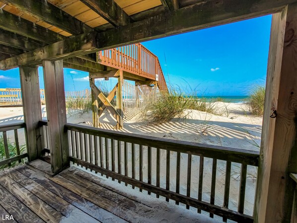 The ground-level covered deck areas are great spaces to hang out outside when the weather is acting up. Grill up some burgers out front or watch the waves from the backside of the house. An enclosed outdoor shower is tucked away below the stairs so that you can rinse off after a long day on the beach. The shower is large enough to double as a storage space for your beach gear as well! The owner has left a few chairs and boogie boards for guests to use during their stay.