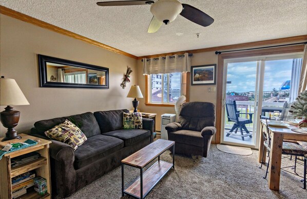 Relax inside in your cozy living area. Your home-away-from-home includes a fully equipped kitchen to prepare special meals during your stay. The bedroom includes a flat-screen TV with a bathroom that's located in the hall. In the hall, you’ll appreciate the coat and ski rack to store your jackets, ski, and board equipment.