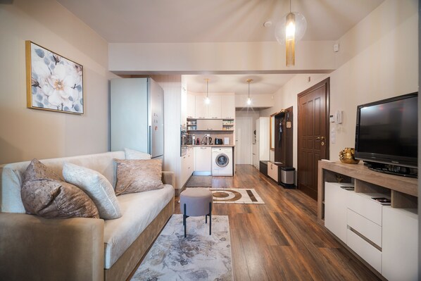 As you walk through the door, you'll be swept off your feet by the stunning modern design and cozy touches. It’s where luxury meets practicality, enveloping you in a sense of home-away-from-home. You're welcomed into a beautifully designed space that radiates modern charm and warmth where every detail has been curated for your comfort and pleasure. The living room, with its cozy seating and tasteful decor, invites you to relax after a day of exploring Sofia or attending business meetings. It's a space where convenience meets luxury, designed to make you feel pampered and at home.