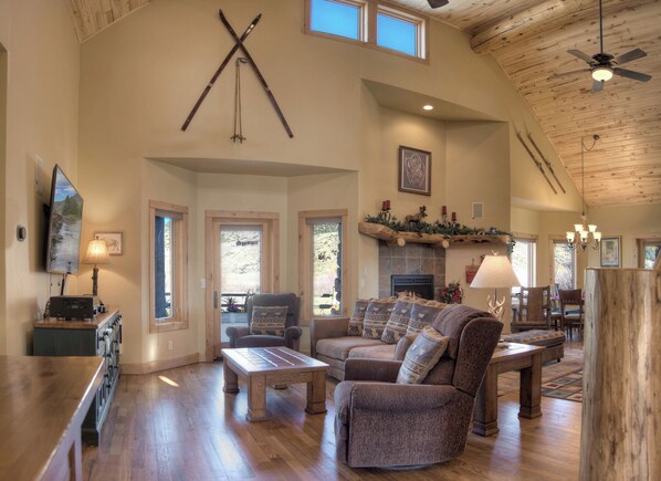 The kitchen is fully equipped to prepare family meals and features JennAir appliances, a dining area with seating for six, and an additional two seats at the bar. Step outside to soak in the stunning scenery. From the porch, enjoy picturesque views of the Rio Grande Club Golf Course, Alder Creek, and the surrounding mountains—all while relaxing by the warmth of the propane fireplace.