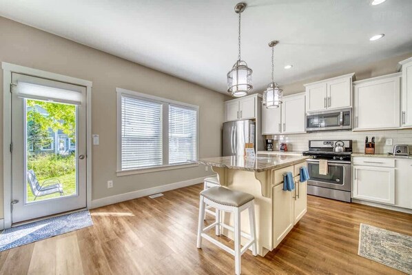 Prepare meals in the expansive, fully equipped kitchen and gather around the separate dining room for shared meals and memories. With five comfortable bedrooms and two inviting living areas, there’s ample space for everyone to relax and unwind. Step outside to the backyard patio to enjoy grilling or utilize the shared fire pit.
