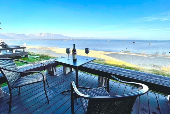 Downstairs is a full kitchen, a living/dining room with a panoramic view of Lake Tahoe. The first floor also has one bedroom with two queen beds and a full bath.