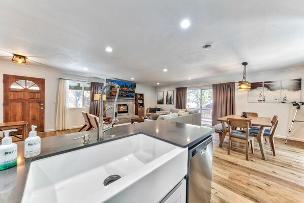 Recently remodeled, this South Lake Tahoe retreat now features beautiful hardwood floors and stylish furnishings designed to cater to every family's needs. The heart of the home is a fully updated kitchen, a culinary enthusiast's dream, equipped with modern stainless steel appliances, grey quartz countertops, and all the essentials needed to prepare delightful meals. The living area, anchored by a stunning 55" TV set above a stone gas fireplace, offers a cozy gathering space for families to unwind and enjoy movies or warm conversations. Each of the three bedrooms has been thoughtfully appointed to ensure comfort and restfulness, including two with luxurious king beds and a dedicated kids' room equipped with a twin bed and pull-out trundle, perfect for little adventurers.