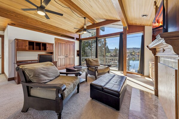 • Upstairs Living Room: Desk, 2 armchairs, half bath, sliding glass doors to balcony