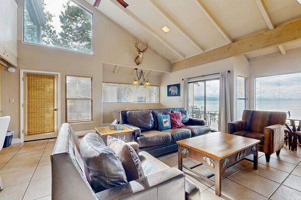 With a gorgeous view of the lake, your five-bedroom with loft townhome boasts vaulted ceilings, a gas fireplace, and a modern, open layout. The full kitchen is well-equipped for prepping your favorite recipes, and there’s plenty of space to gather for mealtime, board games, and puzzles between the living and dining areas. Step out on the deck for a breath of fresh mountain air anytime.
