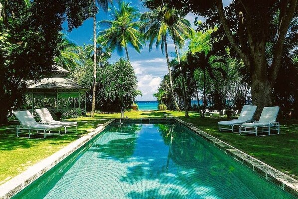 Nelson Gay, et elegant palads med seks soverom korallstein Palladian, ligger på vestkysten av Barbados i en frodig tropisk strandby med nesten to hektar. Nelson Gays hage åpner rett på en fantastisk halv kilometer strand. Det klare, skjermede Karibiske hav er roped av for trygg svømming og er ideell for alle vannsport. Det er også et korallrev for utmerket snorkling. Nelson Gay er bare perfekt for en helt avslappende og uforglemmelig ferie. Den britiske arkitekten Barbara Hill designet det elegante herskapshuset på 1960-tallet, under oppdrag av amerikanske ambassadør Robert M. Scotten som sin private bolig. Inspirert av en roman om livet i Winward Islands, flyttet Hill til Barbados i 1958, hvor hun var grunnlegger av det lokale Institute of Architects og et aktivt medlem av Barbados National Trust. Nelson Gay, designet i West Indian Colonial-stil, regnes som en av Hills beste verk, rangert blant et av Barbados fineste hjem. Senest renovert under ledelse av arkitekten Brian Surfleet, har Nelson Gay opprettholdt en tidløs kvalitet vanskelig å finne i mer nylig bygde eiendommer, blander faglig blanding av klassisk palladisk arkitektur med moderne fasiliteter for å skape den ideelle familieferieinnstillingen. Hjemmet gir elegant innkvartering for et par som ønsker generøs plass til underholdende, og er også romslig nok til en stor gruppe eller familie. Etter å ha nærmet huset ved en sirkulær stasjon, setter hovedinngangen tonen til hjemmets raffinerte tropiske eleganse; Den har en marmorgulv med kompassrosedesign, breezy gitterverk, tropiske planter og imponerende skulpturer. Hallen åpner til stuen, med en 14 'tak med en intrikat smijern lysekrone og mest imponerende, en uhindret utsikt over hagen, bassenget og Karibiske hav like utenfor. Ligger på ett nivå, har huset et sentralt oppholdsrom flankert av to vinger; rommene er romslige, luftige og innredet med en følelse av avslappet eleganse. Designpaletten med hvit med grønn aksent kompletterer det tropiske miljøet, samt den pulserende kunstsamlingen, som inkluderer flere antikviteter og bemerkelsesverdige kunstverk, inkludert en imponerende Erté-veggmaleri og en fin samling av haitiske malerier. Den sørlige fløyen av hjemmet inneholder kjøkken, vaskerom og formell spisestue, et mesterverk i seg selv. Lyset bare ved stearinlys, spisesalen gir en dramatisk, intim setting for kveldsfester. Med spisestue med glass toppet av den berømte designeren Oliver Messel, komplimentert av franske antikke stoler og et utvalg av fem forskjellige stedinnstillinger, inkludert Wedgewood, Rosenthal og Mikasa, kan spisestuen plass til opptil 12 gjester. Det er fem soverom i hovedhuset, hver innredet i en beroligende palett av grønn og hvit, med høykvalitets sengetøy, lysekronebelysning, buede gardiner og flislagt gulv også designet av Messel. Rommene er individuelt klimatiserte og har plasma-TV, kabel- og DVD-spiller for underholdning. Noen har et lite kjøleskap og minibar for ekstra bekvemmelighet. Disse fem soverommene, kombinert med ett soverom hytte, har totalt syv bad (inkludert en "Hans og Hers"), samt en gjestesalong. Ett soverom ligger i South Wing; med sitt eget bad med dusj. Soverommet er utvendige dører brett tilbake for å avsløre en sjarmerende privat uteplass med sittegruppe og frodig løvverk, ideell for en morgen kopp te eller privat avslapning. The North Wing huser de andre fire soverommene, hvorav to består av en imponerende romslig master suite forbundet med et stort bad med dusj; Det er et andre bad i suiten også. Erté Mural Room har en queen size-seng, eget bad med badekar / dusj og tilgang til en overbygd terrasse som åpner til bassenget og hagen. Rommet har blitt tilstrekkelig navngitt på grunn av den unike havfrue veggmaleriet malt av kunstneren på soverommet veggen, hvor han bodde under hans hyppige besøk til Nelson Gay. Født i St. Petersburg i 1892 etablerte Erté seg i Paris som moteillustrator for Harper's Bazaar-magasinet, som han produserte 250 dekker over 22 år. Best husket for de ekstravagante kostymer og scenesettene han designet for Folles-Bergère, regnes han som en av de fremste mote- og sceneprodusentene fra det tjue århundre. Det fjerde og siste soverommet i nordfløyen, det grønne rommet, har to enkeltsenger (som kan kombineres som en stor konge), eget bad med dusj, tilgang til bassengterrassen samt en privat uteplassåpning til hagen. North Wing har også et mediarom med en rekke underholdningsfasiliteter, inkludert en 55-tommers flatskjerm-TV med surround-lyd, kabel-TV og et bibliotek med over 400 DVD-titler. Det er også en dag seng som kan brukes til ekstra enkel overnatting hvis nødvendig. Så imponerende som det indre boligarealet er Nelson Gay utendørs plass den ekte perlen av eiendommen. Komplimentert med frodige grønne løvverk og tropiske blomster, vil innbyggerne sikkert tilbringe mye av sin tid på den 60 meter store terrassen, som nyter omgivelsene. Running ved siden av den sentrale stuen, tilbyr terrassen tre separate områder for lounging eller spisestue ved bassenget. Det skyggelagte salongområdet har en lys, luftig og innbydende appell, med takvifter, hvite polstrede møbler, levende tilbehør og en klar utsikt over hagene og bassenget for å holde øye med barna eller bare for å nyte omgivelsene. Det er to spisestue områder; Den første har et stort bord med plass til opptil 20 personer under et baldakin med vifter, og et mindre bord som ligger ved bassenget i sentrum av terrassen, har full sol eller måneskinn. Terrassen er komplimentert med vakker flora og fauna, samt belysning designet av Bruce Munro. Hagesenteret er det fantastiske 50 ft. Bassenget som strekker seg fra terrassen mot havet i den fjerne enden av plenen; ferdig med italiensk grønn flislegging med innlagt mosaikk av skilpadder og tropiske fisk, er dens fantastiske skjønnhet ytterligere forbedret av dramatisk undervannsbelysning, og skaper en ideell setting for bassengkanten-cocktailer. B