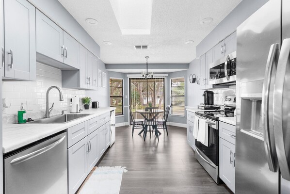The kitchen is stocked with cookware, utensils, and appliances, including a Nespresso coffee maker (pods included), tea kettle (with tea), toaster and more.