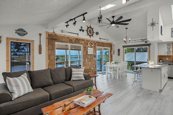9 year old describing it Super duper duper awesome! House was great for 2 families of four with kids in the double queen room. Place had all kinds of stuff to do and use, great outdoor setup. Amazing view and sunsets. Great spot for beginner kayakers, bring water shoes for getting in and out. Bottom suite you do have to go outside to access from main area. Hosts had fantastic communication and were very helpful. Highly recommend.
