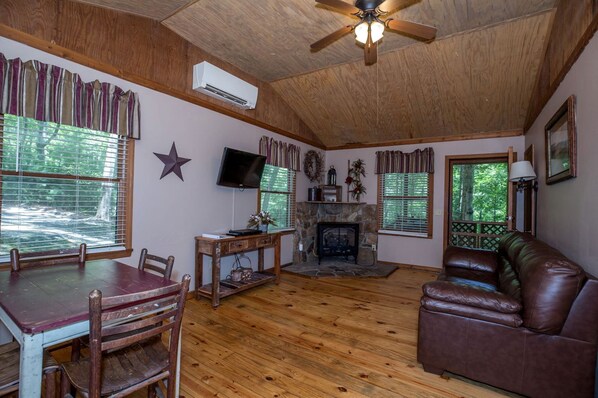 Tucked among mountain laurel and towering pines, these cozy one-bedroom cabins offer a peaceful retreat close to the campground, pond, and scenic hiking trails. Inside, enjoy a comfortable queen bed, inviting living area with a gas fireplace, a fully equipped kitchen, private bathroom, and air conditioning for year-round comfort. Bring your furry companions along—up to two pets are welcome for a small nightly fee. Perfect for a relaxing escape for two.
