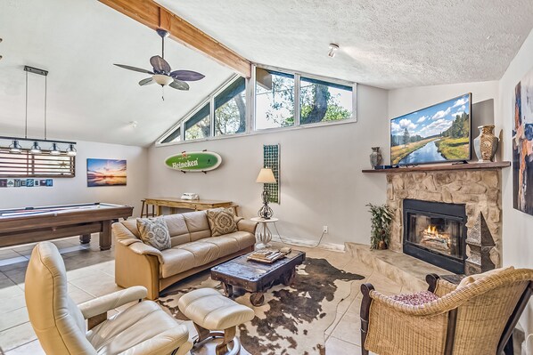 Come relax at this home built for fun times! Upon first entering this home, guests will first see come across the game room corner featuring table shuffleboard and the home's private pool table. It sets the tone perfectly for this eclectic home full of space to enjoy each other's company. Cool down inside in the central air conditioning or get some fresh air out on the furnished patio. A two-person, built-in desk can provide a workspace for guests that need to complete remote work or schooling. At mealtimes, guests can enjoy cooking together in the full kitchen, equipped with full-size appliances, a dishwasher to help with cleanup, and a breakfast bar that seats two guests for a casual meal.