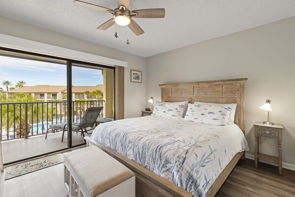 This tastefully decorated and comfortably furnished third floor end unit is ideally situated overlooking the beautiful tropical lagoon and pool and just a short stroll to the community beach access. The primary bedroom has a King bed and en suite bath. The second bedroom has a Queen and Twins in the third with additional sleeping available with the living room sleeper sofa. Features include cable TVs in all rooms, a fully equipped kitchen, ceiling fans throughout and a large, private balcony. A full size washer and dryer are located in your private laundry room just outside your front door. The complex offers two large pools for all guests, an Oceanside Pool just a few steps from the sand and a lusciously landscaped Lagoon Island Pool. The Lagoon Island Pool is also heated for your winter enjoyment. A large gazebo, located between the beach and the ocean pool, offers immediate shade and shelter from the sun. A handicap ramp is also available for our guests with special needs. Ocean Villas Condominium Community is ideally located within walking distance to popular beach front attractions, restaurants, and shopping.