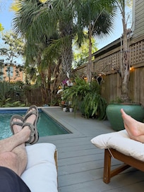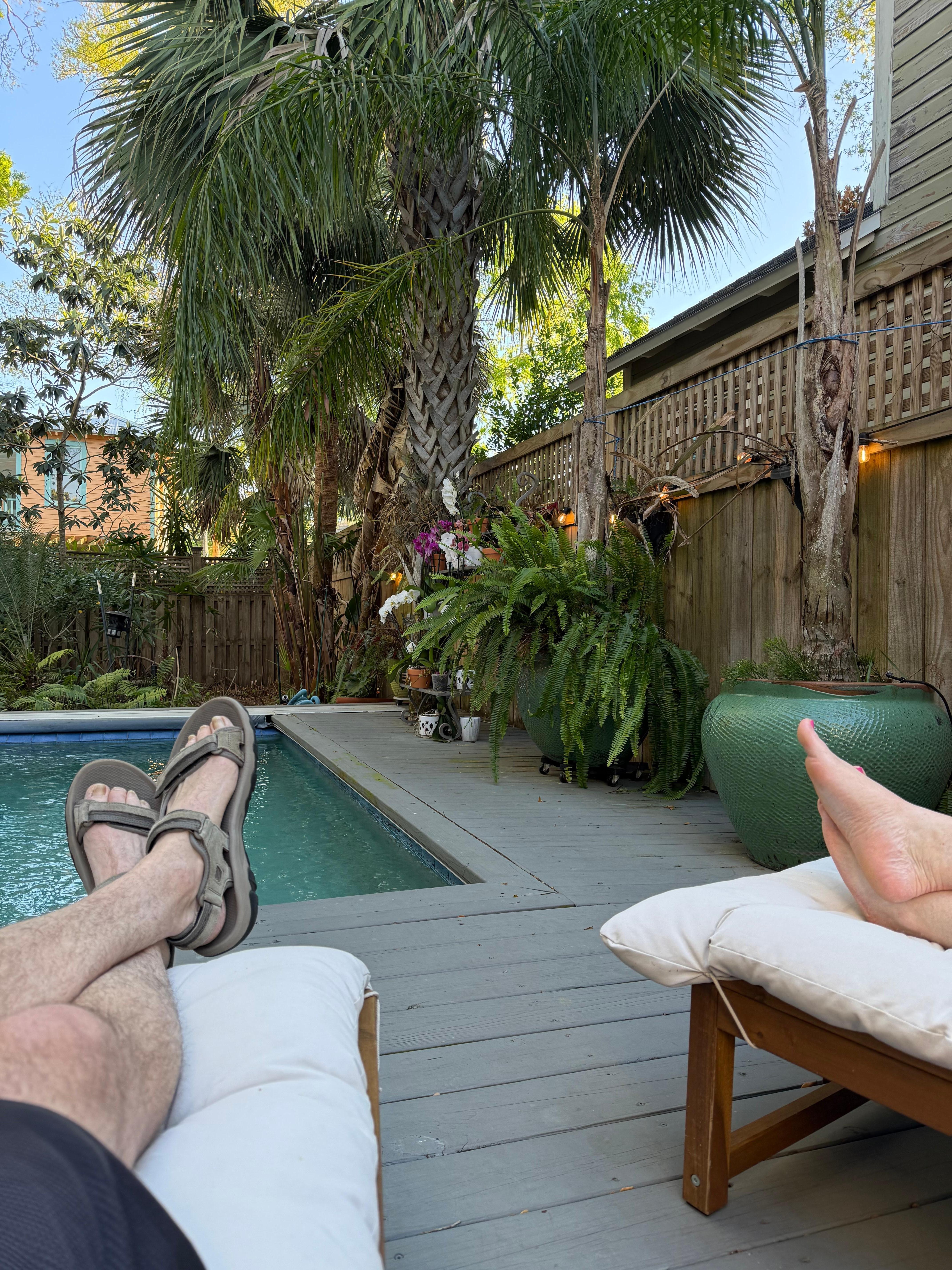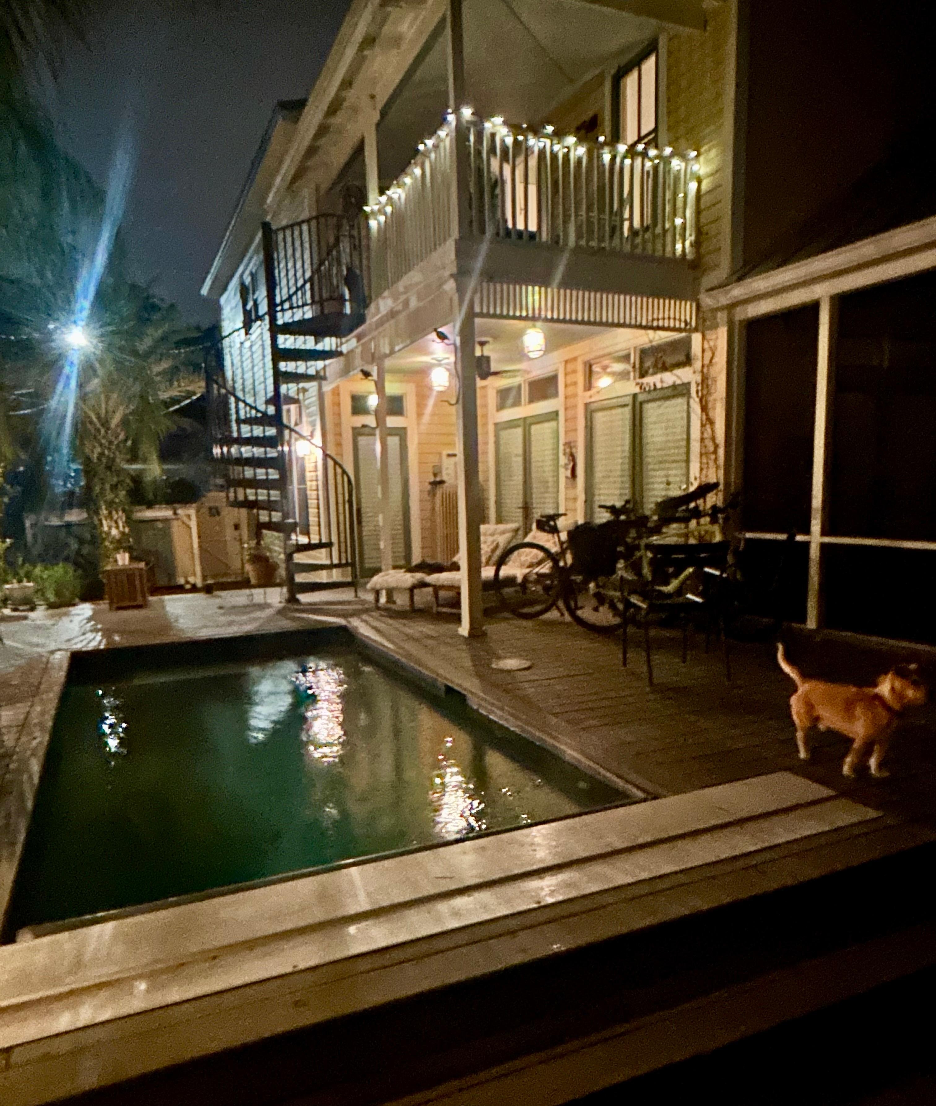 A spiral staircase leads to the second floor studio porch. The space itself is small but adequate for two people and my dog Nigel with ample kitchen items, a mini fridge and a very nice bathroom with a great shower! A quiet street with a coffee shop was just two blocks away and the location made it easy biking into town. The weather did not cooperate for most of our three night stay so we did not use the pool or deck area due to the cooler temperatures. The pool is solar heated and the sun was not peeking through too often. Our spotty internet connection issues were quickly addressed by Chuck!