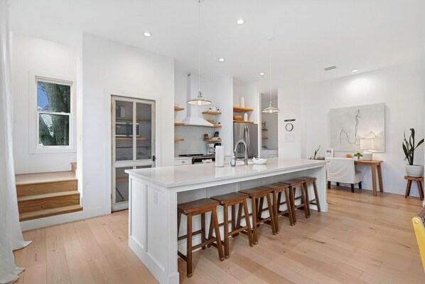 Uptown Carriage in St. Augustine is a light-filled, spacious rental that comfortably accommodates eight guests. Main level featuring one king bedroom. Upstairs loft has a billiards room, 3 adjoining sleeping areas - 1 king sleeping area with barn doors for privacy and 2 additional sleeping area with 2 twin beds each and privacy curtains. This newly constructed carriage house sits on the grounds of a historic 1908 property. It’s also home to the Sunday Gathering Table and Jenna Alexander Studio. Enjoy a full kitchen and in-unit laundry for added comfort and convenience during your stay.