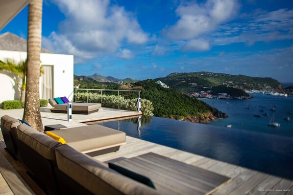 Villa Utopic is a very modern and spacious villa featuring an amazing infinity swimming pool in front of the sparkling sea. In the living room, photo works and touches of bright colours tastefully blend with the soothing tones of the fabrics. This most inspired combination makes the living room a true place of relaxation. A retractable screen is also at your disposal for pleasant movie nights. The kitchen is well equipped to cook meals or to call upon a private chef for any festive event. In addition, the glazed living room opens onto a breathtaking view over the sea and the harbour of Gustavia, like a beautiful art that you’ll love watching and admiring.