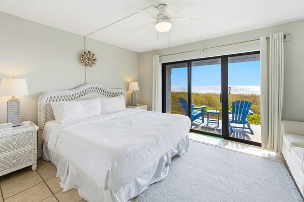 The primary bedroom has a king bed and master bathroom (shower), private beachfront deck access and a flat screen smart TV. The bunk bedroom has 1 stand alone twin bed and 1 bunk bed (double on bottom, twin on top) with access to the shared hallway shower/tub bathroom. Sleeps a total of 8 guests comfortably. The washer and dryer are located in the shared hallway bathroom.