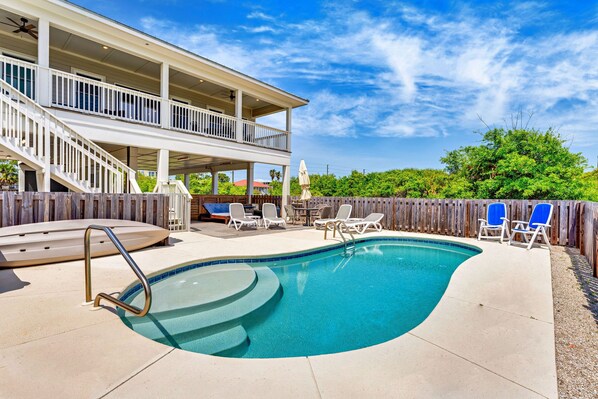 The covered, furnished deck as well as the large, furnished poolside deck area means there’s lots of room to spread out and enjoy living on island time. The beach boardwalk is simply around the corner from the house, so whether you spend the day splashing in the surf and searching for seashells or relaxing by the private pool with a good book and a refreshing beverage, guests at Island Tide have lots of options for enjoying their beach vacation!