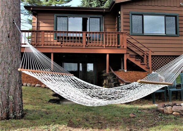 På sjøsiden er det et ildsted med rikelig med sitteplasser sammen med en hengekøye for å nyte de vakre sommerdager og netter.