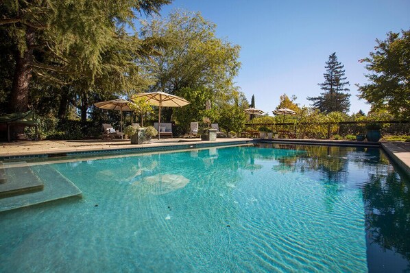 Vandre ut av 8 ft. skyve glassdørene fra spisestuen eller stuen vil bringe deg inn i hagen. Spise lunsj under rose og blåregn dekket pergola som vil romme opptil 12 personer komfortabelt, eller vandre inn i bassengområdet for en bar-b-que eller en svømmetur. Badestamp ser ut over vinmarkene og om kvelden kan du se nesten hver stjerne i galaksen. Hvis du er lei av, lese en bok i hengekøya. Hvis du ønsker en aktivitet, spille boccia ball eller shuffleboard. Barna kan være opptatt i lekehus med den lite person størrelse kjøkken eller de kan klatre inn trehytte over bassenget og heise pirat flagg. Turer kan tas opp til Flora Springs vingård eller ned en av en rekke sjarmerende landeveier. Det finnes også en rekke sykkelveier og kjører baner for de som ønsker mer kraftig mosjon. Lake Hennessy er ca 15 minutter unna for de som ønsker å fiske, eller kjøre opp til Mt. St. Helena for en klatretur, eller våkne opp tidlig en morgen og ta en varmluftsballong over dalen med frokost på slutten. Men, er en tur til Napa Valley ikke komplett uten besøk på våre fantastiske vinprodusenter. Vi er i gangavstand fra mange inkludert Whitehall, Franciscan, Kelham, Milat, Livingston, Hall, Heitz og Raymond- bare for å nevne noen.