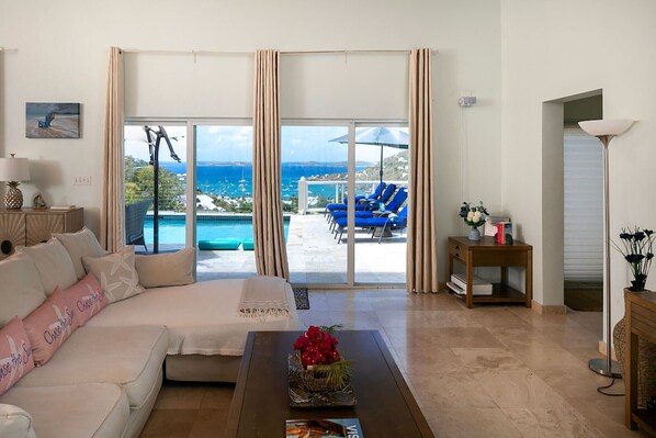 Each of the 4 suites has king size beds, large walk-in showers with walk-in closets all with stunning views of Great Cruz Bay. The lower level of the villa has a second great room equipped with a pool table, refrigerator and another flat screen TV, perfect for staying in and entertaining or relaxing while enjoying total seclusion. We're sure Chase the Sun will become your favorite home away from home!