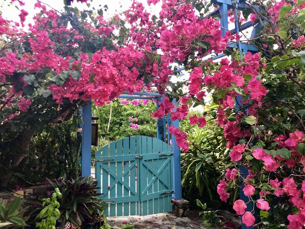 Naturstier på stedet: Det beste av St. Johns naturlige skjønnhet og forbløffende biologisk mangfold ligger på stedet rett utenfor døren din. En trellised buegang med hengende tropiske blomster hilser på deg når du går inn og går ned en kort steintrapp til inngangsdøren. Den store (2/3 hektar) åssiden er et økologisk underland som inviterer til å vandre - vakre håndlagde steinbaner og grusstier på flere forskjellige nivåer fører deg gjennom det frodige løvtræret av Guavaberry Woods, hvor pittoreske og unike dammer, en meditasjon hage, bro og benker, pluss hager av orkideer, frangipani, hibiskus, bouganvilla, sitrus og tropiske frukttrær gleder øynene.