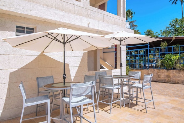 - Outdoor seating area with tables and chairs, perfect for relaxing or socializing.
