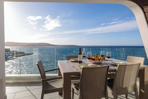 Elegant seaview apartment in the heart of Bugibba. Enjoy modern design, a cozy bedroom, and a bright living area with a private terrace overlooking the Mediterranean — perfect for a relaxing coastal getaway.