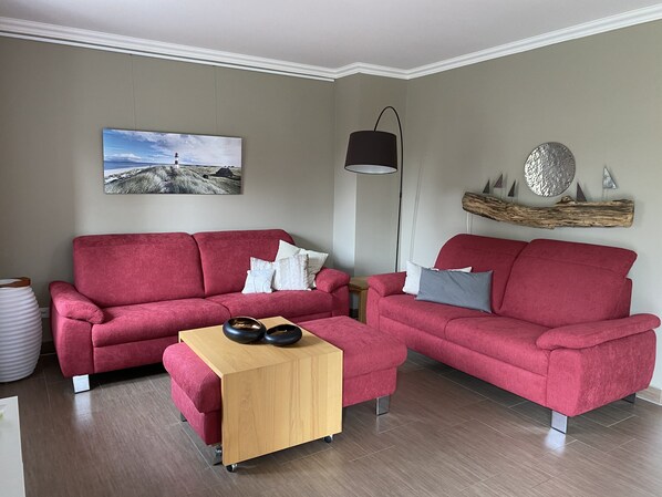 I den første Etasje er det to soverom, hver med 15 m² og et stort bad med badekar, dusj, toalett og to vasker. Hovedsoverommet har en stor dobbeltseng 200 x 200 cm og en stor garderobe. Barnerommet har to enkeltsenger (90 x 200 cm) og skuffeskap utstyrt. Det er noen leker. På loftet studio, har vi et bilde vindu med utsikt over landskapet. Utvalget begeistret når fullført ekstra stor stue og soveområde med 2 faste senger og en sofa.