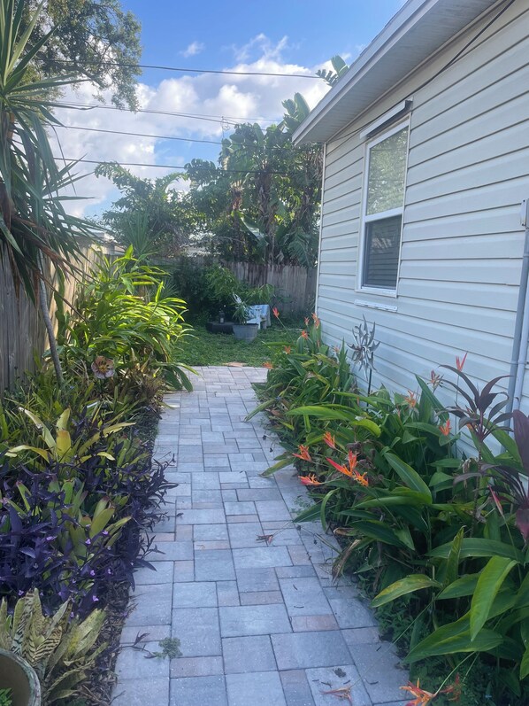 Step through a tropical oasis to a bright & spacious, centrally located, private entrance suite behind my home. Unwind on your private patio with hot tub, dining set, grill, chaise lounges & fire pit. Kitchenette w/necessities, range, air fryer, etc. Tranquil private bath w/ dual head walk-in shower. Get restful sleep on the Sealy king mattress w/ adjustable headboard. Only shared space is laundry room. AC control in owner unit - text to adjust. Beaches & downtown 15 min. Driveway parking in safe neighborhood. No guests or parties please.