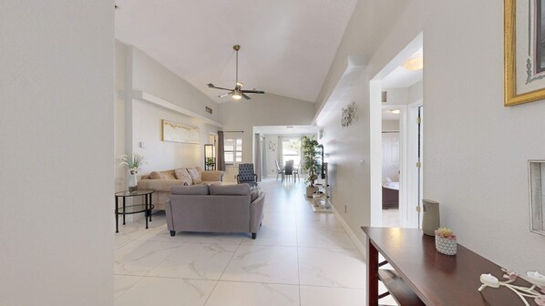 This fully renovated home offers updated bathrooms and include a king bed, queen bed, and twin beds offering plenty of privacy and space for families. This home can comfortably accommodate families or friends needing a relaxing break. The living room is a cozy spot to unwind, complete with a smart TV for entertainment.