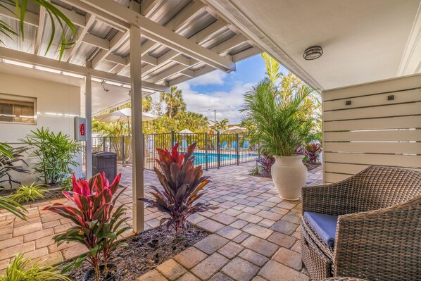 As you walk out into the gated entrance to the resort you are surrounded by a private oasis featuring a large outdoor heated pool with plenty of sun loungers and other comfortable seating. Tropical Coquina Cove Studio # 4 is tastefully decorated in modern Florida Style & Colors.