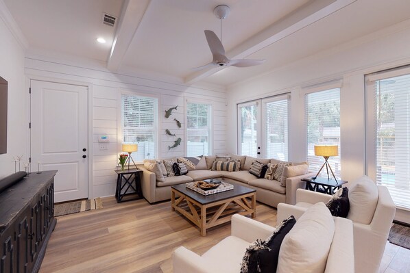 Family room with a Samsung Smart TV 75" and Sonos ARC sound bar, overlooking large, screened-in porch and pool