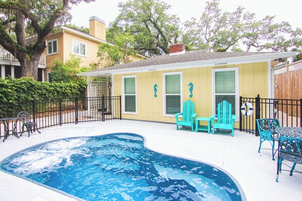The beach is a block away -- plus there is a PRIVATE POOL nestled behind a plush, tropical garden. This pool has seating along the inside wall and is a great place to cool off. This breathtaking property is perfect for every season.