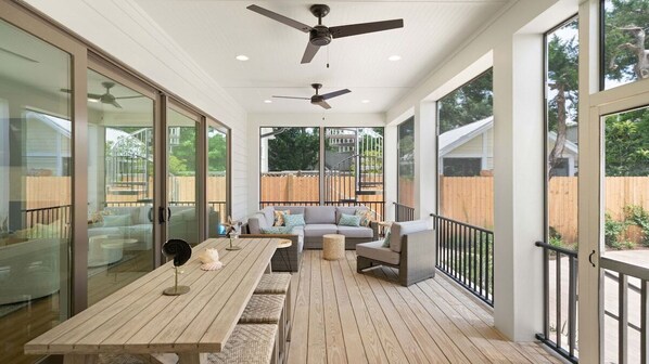 Dining area is set up for 6 guests, 2 bar stools and an outdoor dining table on screened in porch is set up for 6 guests. Screened in porch also has a sectional sofa.