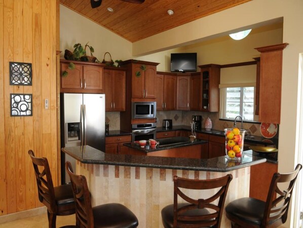 Jasmine villa tilbyr alle hjemmets bekvemmeligheter! Det profesjonelle sentrumskjøkkenet ble nøye designet for å tilberede gourmetmåltider og er enhver kokkes drøm. Den er utstyrt med benkeplater av granitt, rustfritt stål apparater tilpasset kirsebærskap, travertingulv, spiskammer, en koselig frokost- eller drikkebar med fem virvlende krakker og en flatskjerm-TV for å se nyhetene, favorittidretten eller showet mens du spiser. Utemøbler og en gassgrill tilbys for utendørs servering.