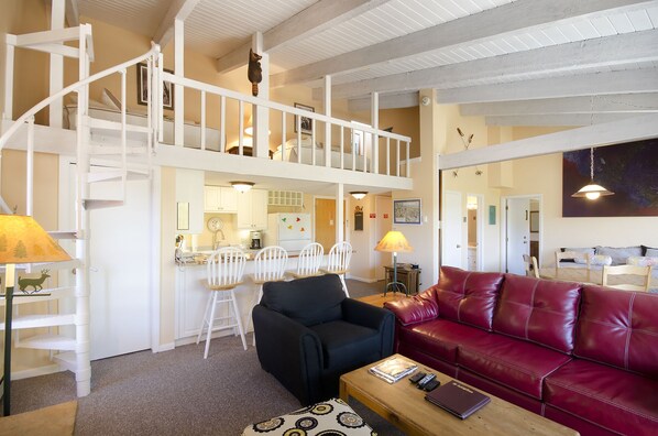 Denne øverste etasje hjørnet To soverom Plus Loft Condominium har fjellutsikt og egen balkong. Det er plass til seks ved spisebordet og fire på kjøkkenbordet. Stuen har en 37 tommers flatskjerm-TV med DVD-spiller og gasspeis. Hovednivået master bedroom har en king size-seng, 20 tommers TV med en DVD-spiller og et eget bad. Det er et studioområde mellom master og stue som har en trille seng med tilgang til fellesarealbadet. Studioet har en trekkmur for privatliv. Ovenpå (spiraltrapp) er det andre soverommet og loftet. Loftet har 2 enkeltsenger og eget bad. Det andre soverommet har en Split King-seng, og en 19 tommers flatskjerm-TV med DVD-spiller. Den splittede kongen seng kan gjøres til to enkeltsenger på forespørsel.