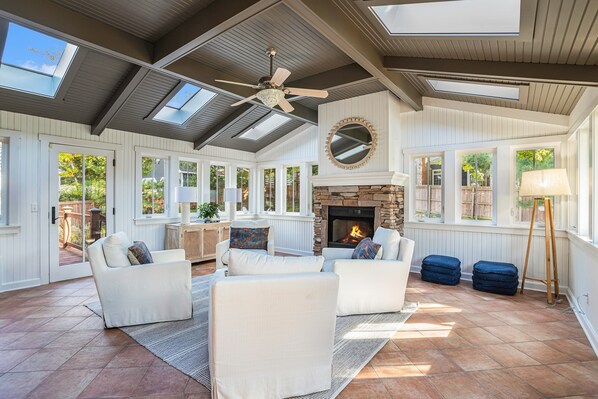 When you enter the house, you will be greeted by over 3,900 square feet of open, bright, and airy living space with hardwood and heated tile floors throughout - perfect for entertaining! Create everlasting memories with your loved ones in the welcoming living room, furnished with an extensive sectional, a fireplace, and a large smart TV with streaming to keep you entertained during your stay. Free high-speed WiFi throughout the home will make streaming a breeze. Prepare delicious culinary masterpieces in the spacious cook's kitchen with stainless steel appliances and granite countertops. Attached to the kitchen is a comfy sunroom that leads to the deck and enclosed backyard with beautiful lawn and gardens.